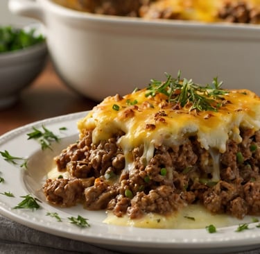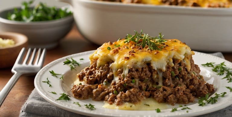 A comforting, cheesy beef and potato casserole baked to golden perfection, perfect for a family dinner