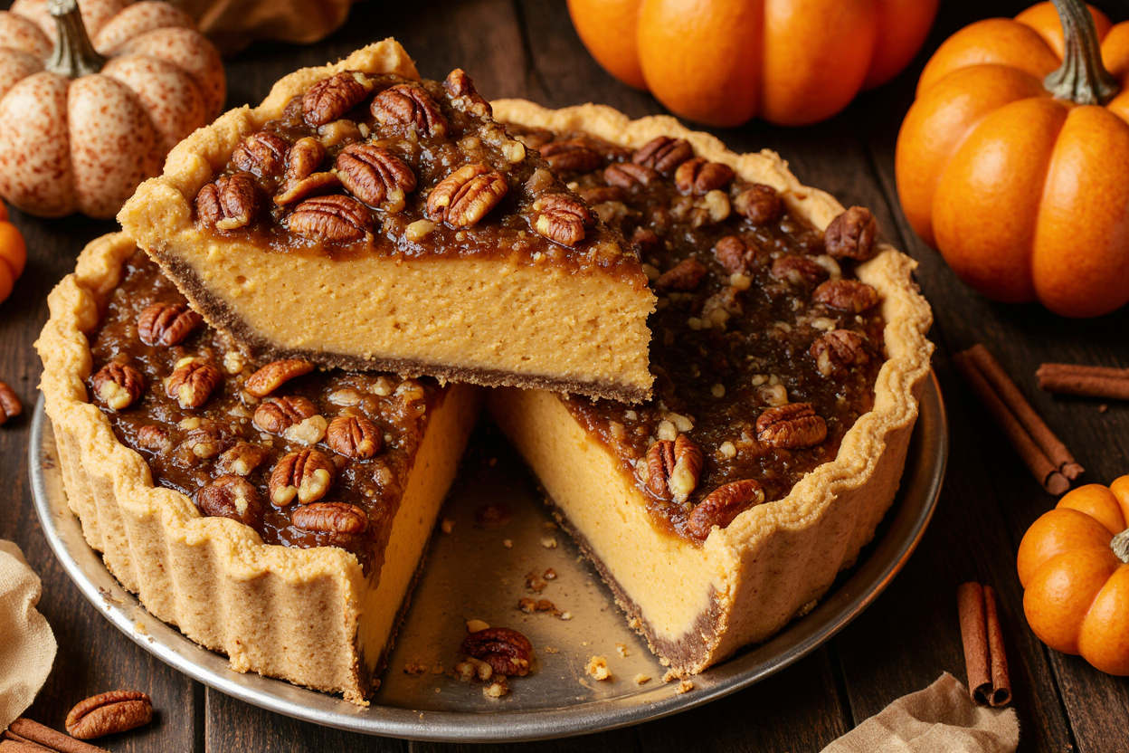 Praline Pumpkin Pie โ Creamy Pumpkin Filling with a Sweet Crunchy Pecan Topping